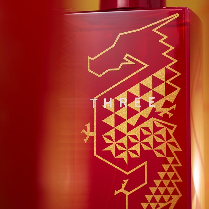 THREE以结构,展现平衡姿态,搭配三角形的鳞片设计,象徵东方9X9的美好寓意。 因应年节氛围,瓶身以金色图样展现龙的活跃能量,并以(是指画龙时,龙首至龙喉、龙喉至龙腹、龙腹至龙尾,三部分长度相等。)结构展现平衡姿态,搭配三角形的鳞片设计,呈现简约却又华丽的样貌,共81片的龙鳞片,象徵东方9X9的美好寓意,深具巧思。