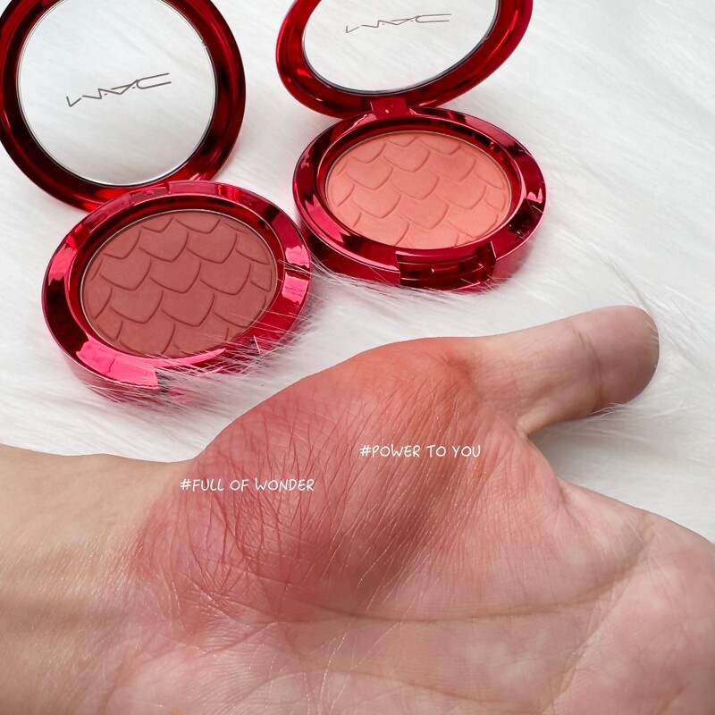 M.A.C炽爱之心时尚腮红 (#FULL OF WONDER 暖郁勃根地、#POWER TO YOU蜜桃香槟),NT1,750 4.炽爱之心金属光炫彩打亮液:饱和的金属液体,轻轻抹开直接与肌肤融合成宛若天生的高订镀铜肤感。零死角闪耀高光,细緻不显纹。