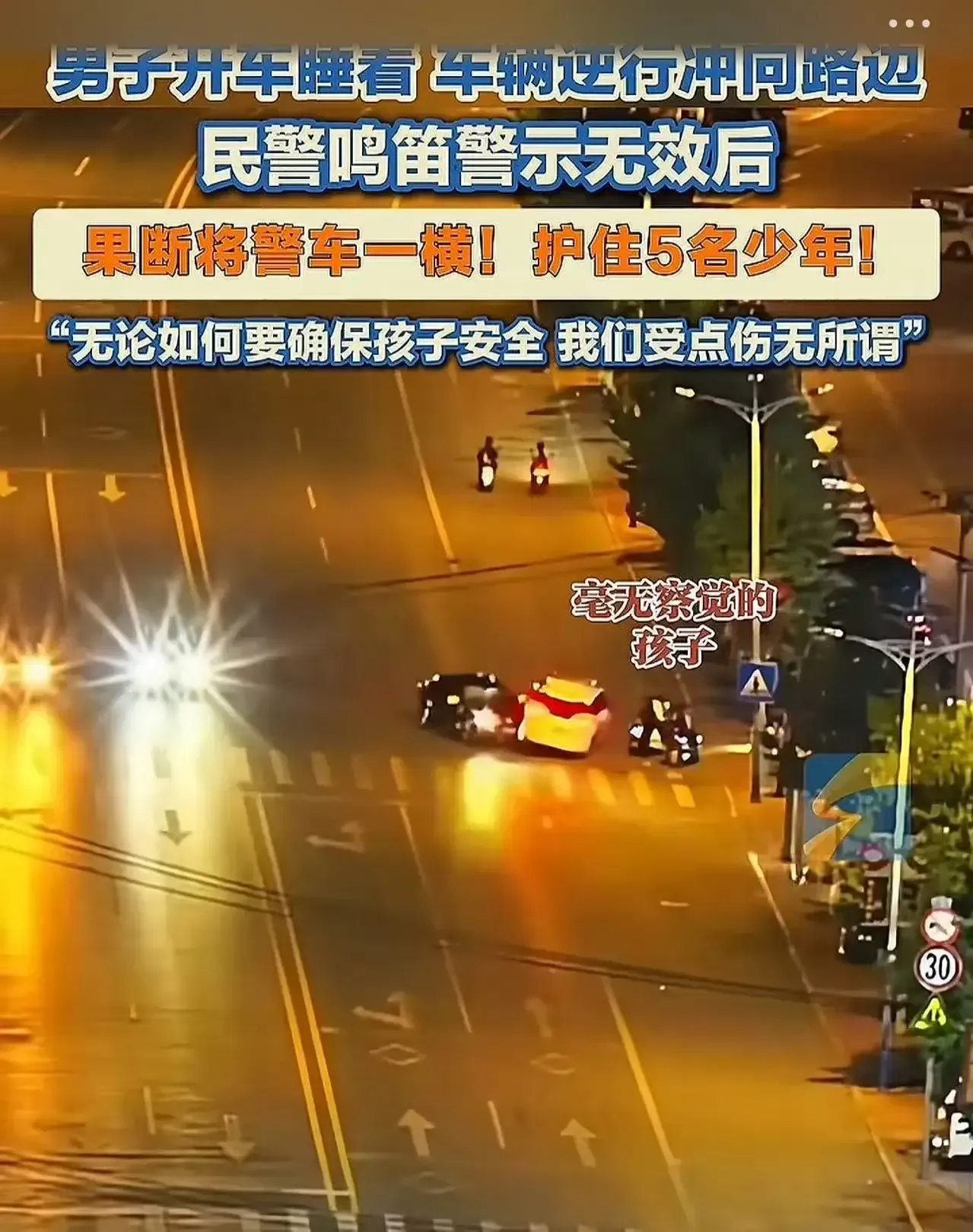 恰在这时,河东派出所民警赵某驾驶着警车路过此地。他敏锐地察觉到轿车径直朝着孩子们冲去,危急时刻,赵某立刻警觉地连按几下喇叭,试图提醒轿车司机。